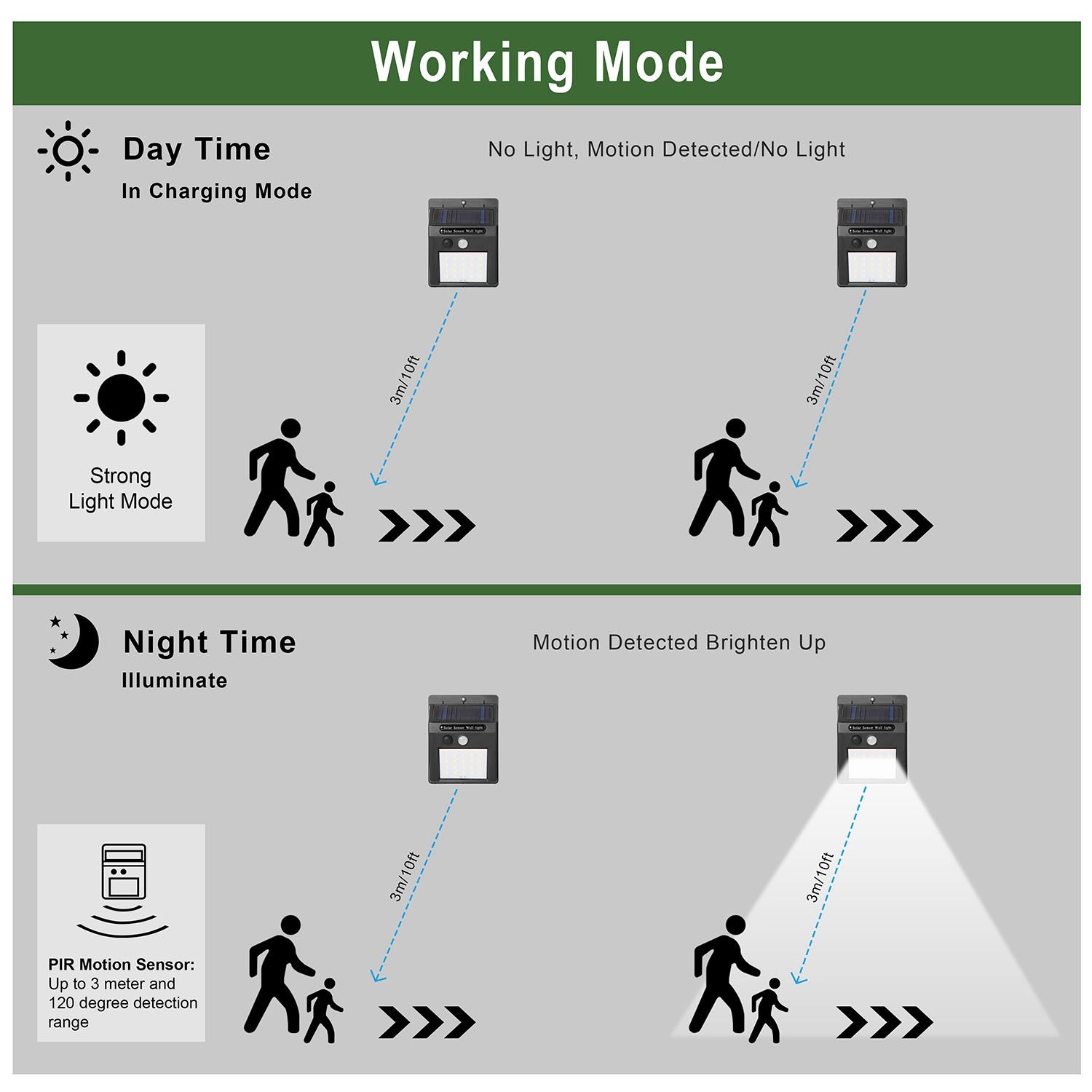*Upgraded Solar Light*:Adopts advanced PIR motion sensor and no dim mode design; during the day the solar light will automatically switch off to save energy; and it will turn on when motions is detected within 3m in darkness or at night for safety protection.