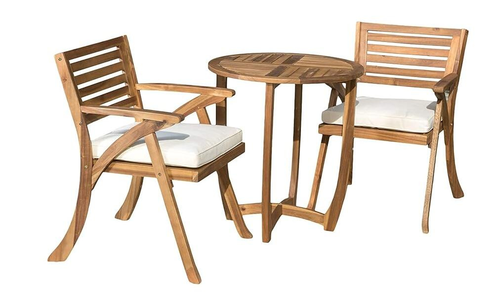 About this itemThe Toulon Bistro set features a beautiful, classic design. This set is ideal for an intimate outdoor dinner party or just to sit back and relax with some friends on a beautiful day. It's functional all-year round and will retain its looks for years to come.Includes: Two (2) Arm Chairs, One (1) TableMaterial: Acacia Non FSCColor: Teak FinishSome Assembly RequiredArmchair: 26.77"D x 24.80"W x 34.25"HSeat: 20.47"W x 20.07"D x 17.52"HArm Height: 26.38"Table: 27.56"D x 27.56"W x 29.50"H
